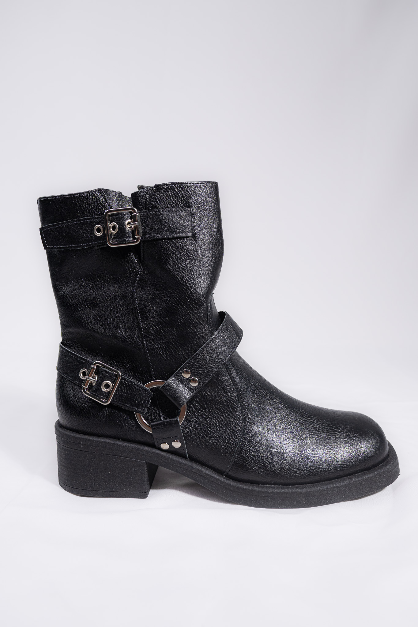 Bota Biker rock, uma bota estilosa e cheia de personalidade, inspirada na últimas tendências. Salto bloco de 4 centímetros, cor preta, bico levemente quadrado, palmilha comfy, toda forrada por dentro, detalhes em fivelas laterais e possui fechamento em zíper.